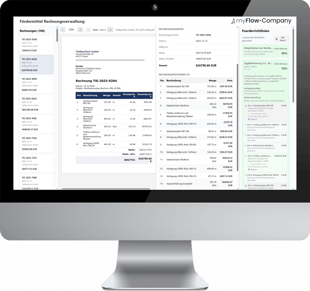 Aus diesen Fragestellungen heraus entstanden die ersten Umsetzungen bei myFlow•. Ziel war es, Rechnungen so aufzubereiten, dass Förderfähigkeit strukturiert, kontextbezogen und nachvollziehbar geprüft werden kann – unabhängig davon, ob es sich um Glasfaser- oder Wärmenetzprojekte handelt.